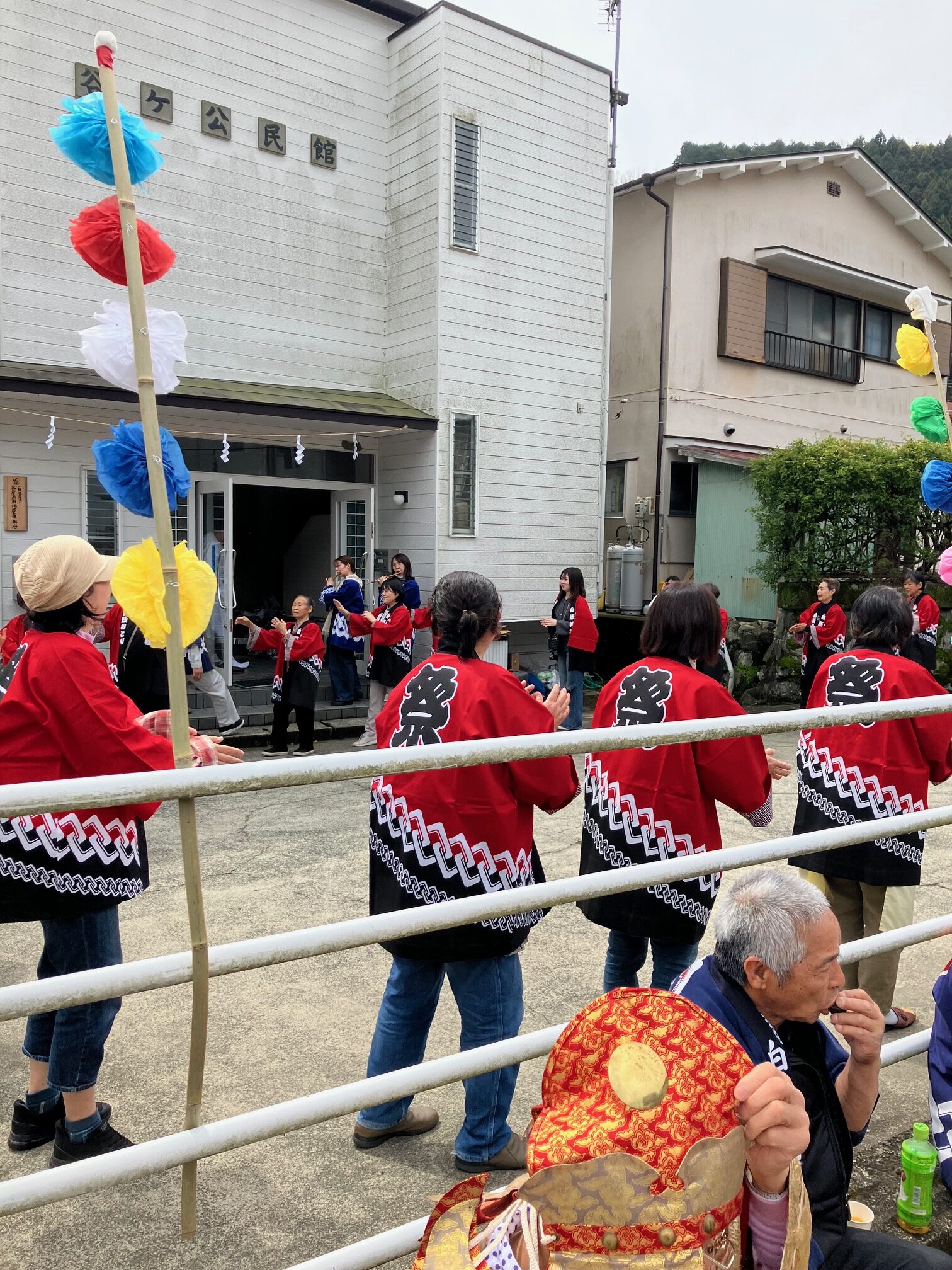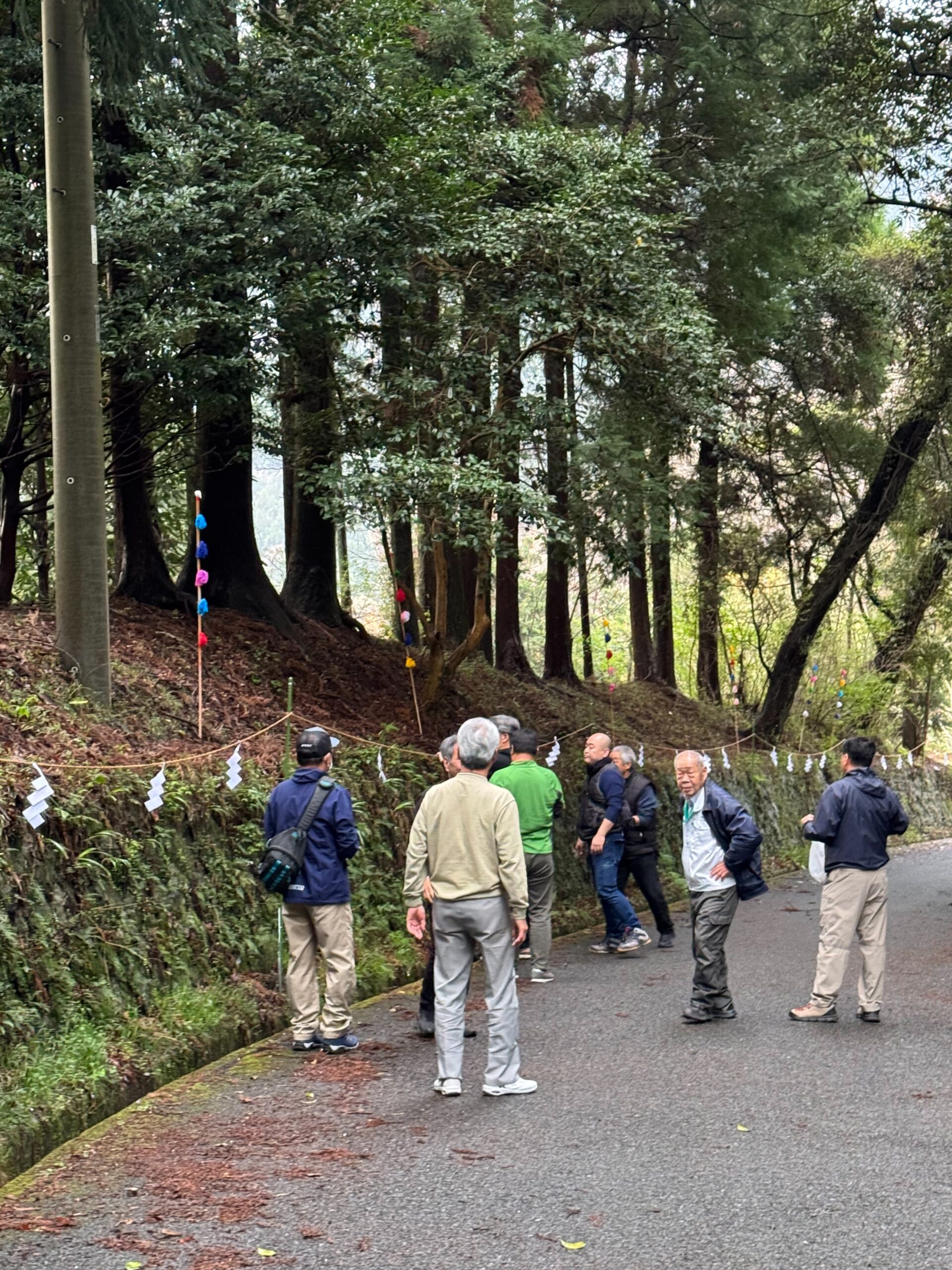 前の晩に比較的強い雨が降り、雨が残っていましたが大祭当日は上がる予報で大祭準備を行いました。例年通り組毎に担当区域の清掃、しめ縄はり、花の飾り付けを行いましたが雨が降っていたため、どの組もおしめの飾り付けは大祭当日の早朝に行う段取りとなったようです。